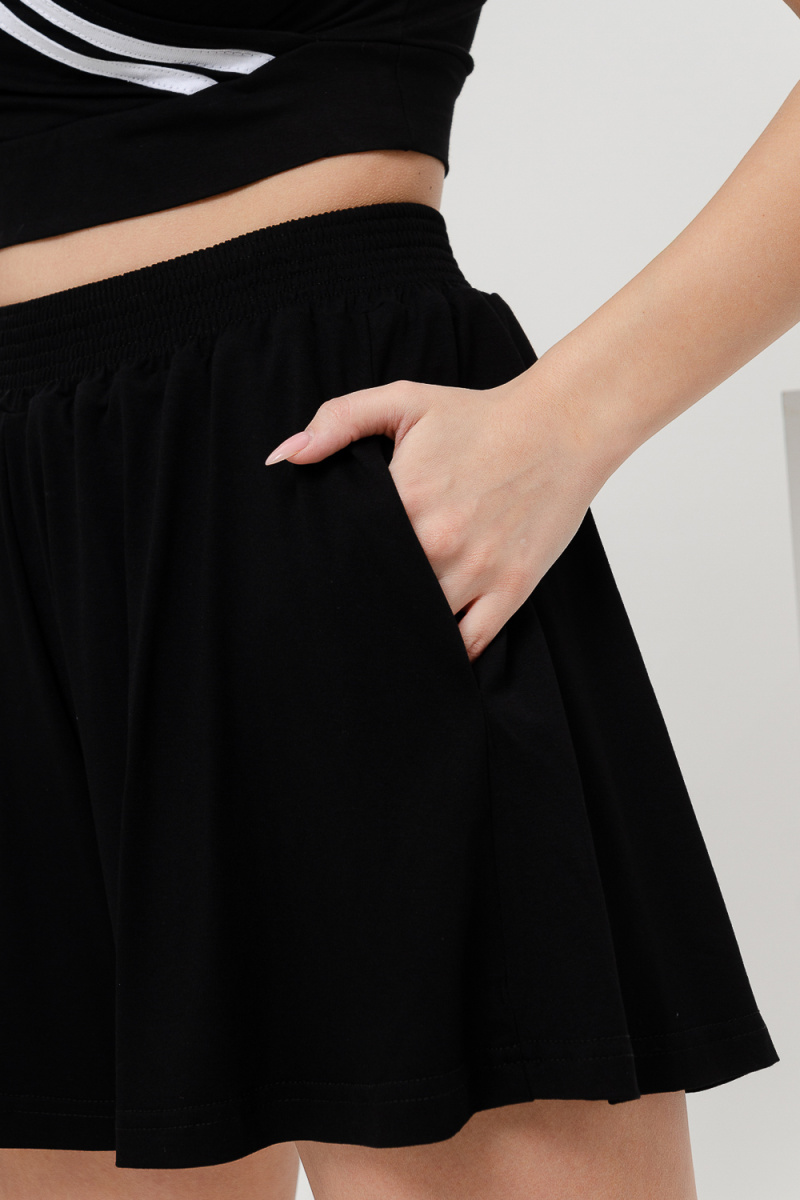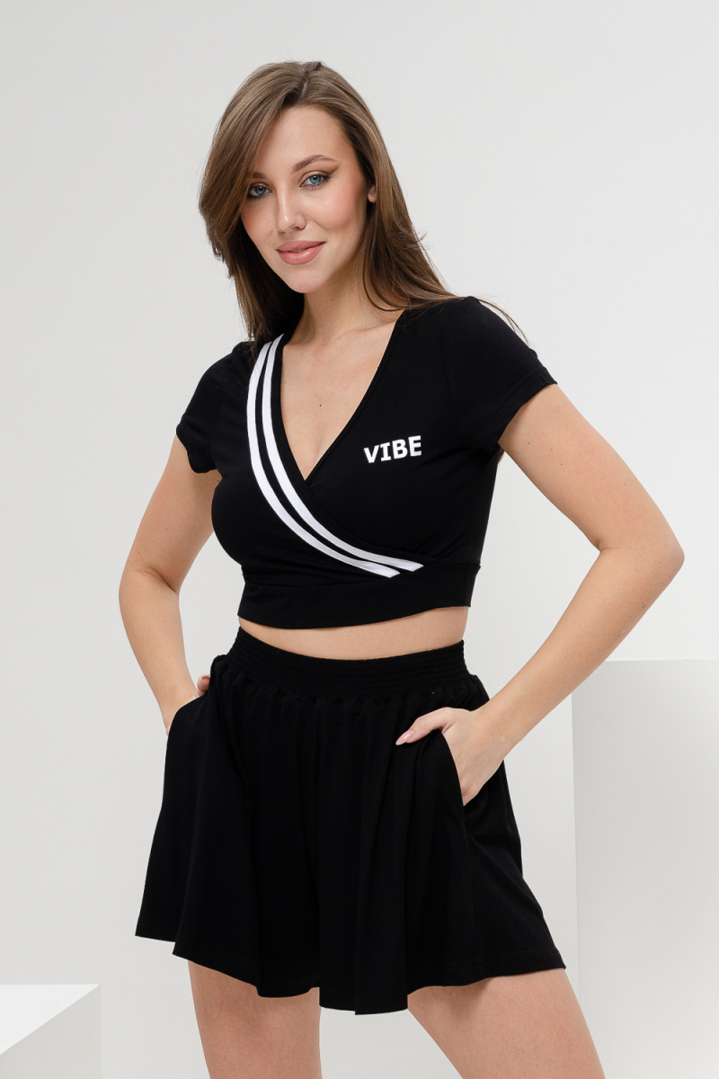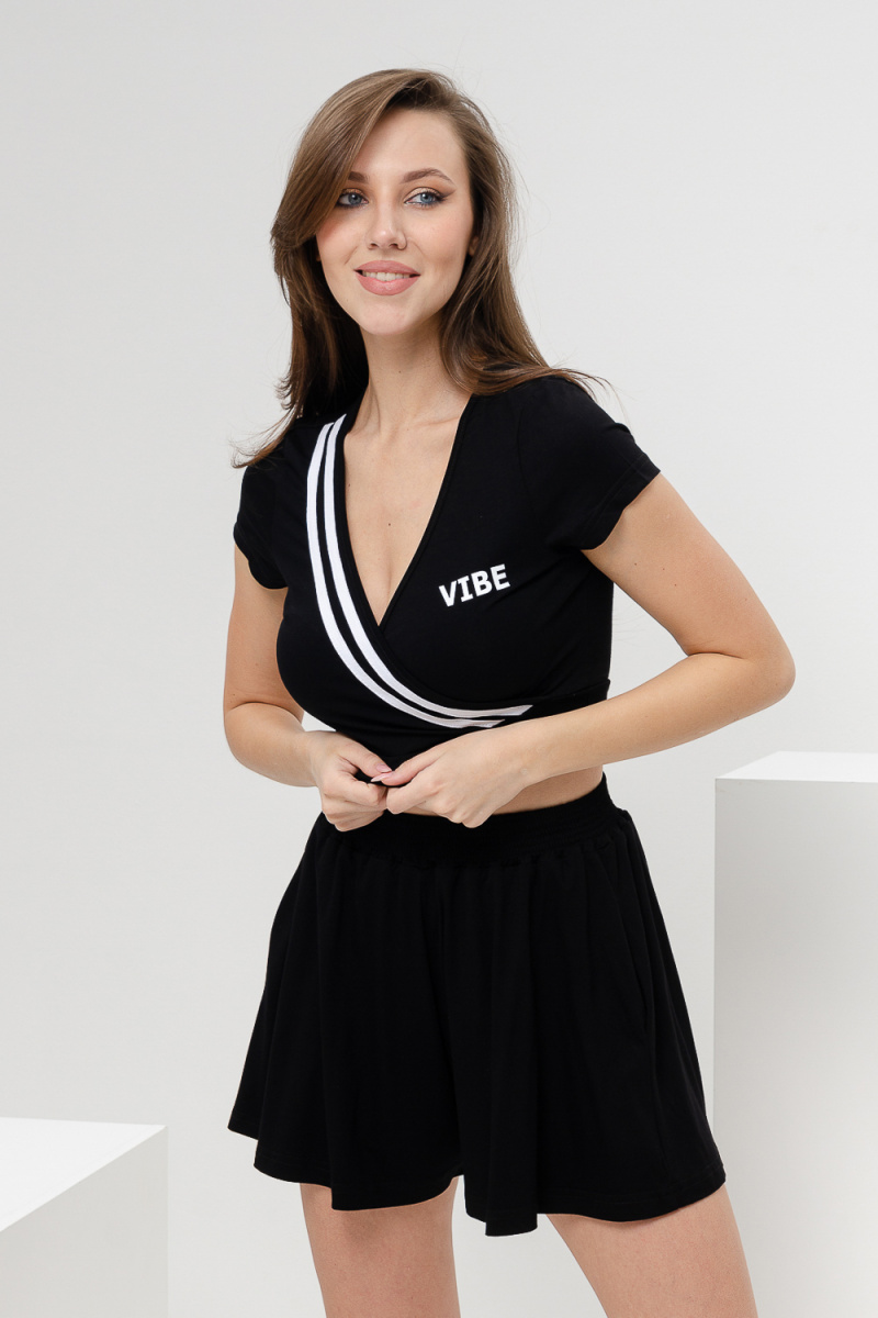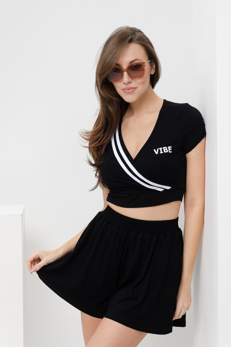 Комплект состоит из топа и шорт. Топ с V-образной горловиной, с коротким рукавом, с поясом по низу, длиной выше линии талии. Вдоль линии запаха правой полочки расположены лампасы контрастного цвета. Горловина обработана бейкой из основного полотна. Шорты-юбка расклешенные, короткие, с боковыми карманами, на эластичном поясе.